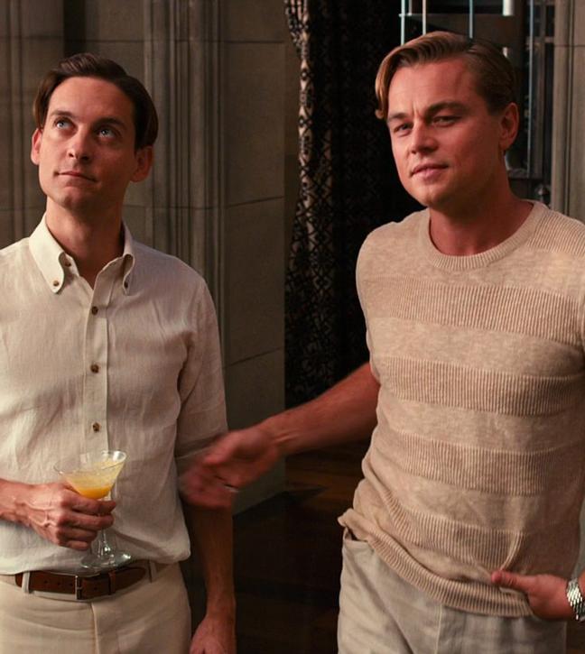 DiCaprio, especially, embraced luxurious jerseys and jumpers. His caramel-coloured knitwear was exquisitely woven and impossibly fine. To follow his natty lead, look no further than Artknit Studios’ mulberry silk sweater, or this cable-knit option from kings of prep, Ralph Lauren. Alternatively, give a West Egg-appropriate nod to the nautical with Hemingsworth’s striped raglan sweatshirt.