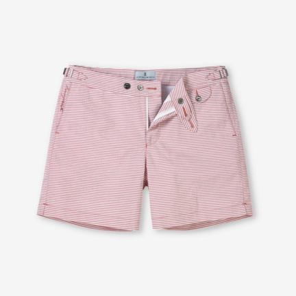 In fact, you should embrace the colour. Just look how good Redford and DiCaprio look in the shade. So, if you do decide to go full Gatsby, Tom Ford’s ‘Shelton’ suit is suitably salmon. Otherwise, incorporate the colour in subtler ways — such as an Emma Willis shirt or a pair of softly-striped Hemingsworth swim shorts, perfect for a dip in the pool (just clear the area of disgruntled garage owners before you dive into the deep end…)