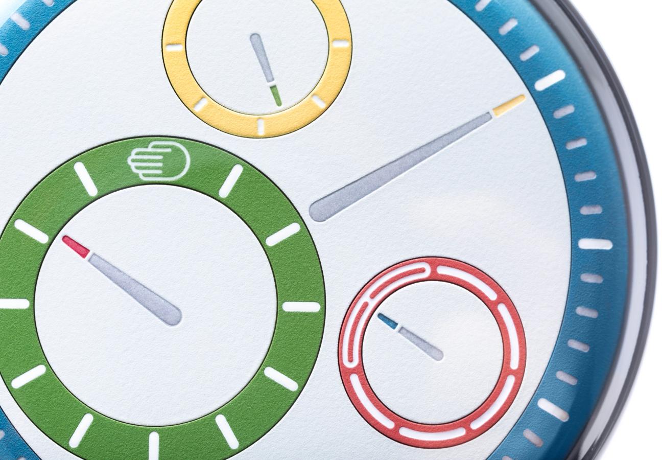 The Type 1 Round Multicolour, in particular, has brought us an abundance of joy in months gone by. Though we can talk for hours about the double-domed sapphire crystal top and the fairly nifty 36-hour power reserve, it’s those sub-dials, this time in poppy, block tones, that we love the most: the hour disc is displayed in green, the seconds are shown in yellow, and the days are expressed in red. The minute track, in blue with white indicators, encircles all this, and a light-grey backdrop underlines the contrast.