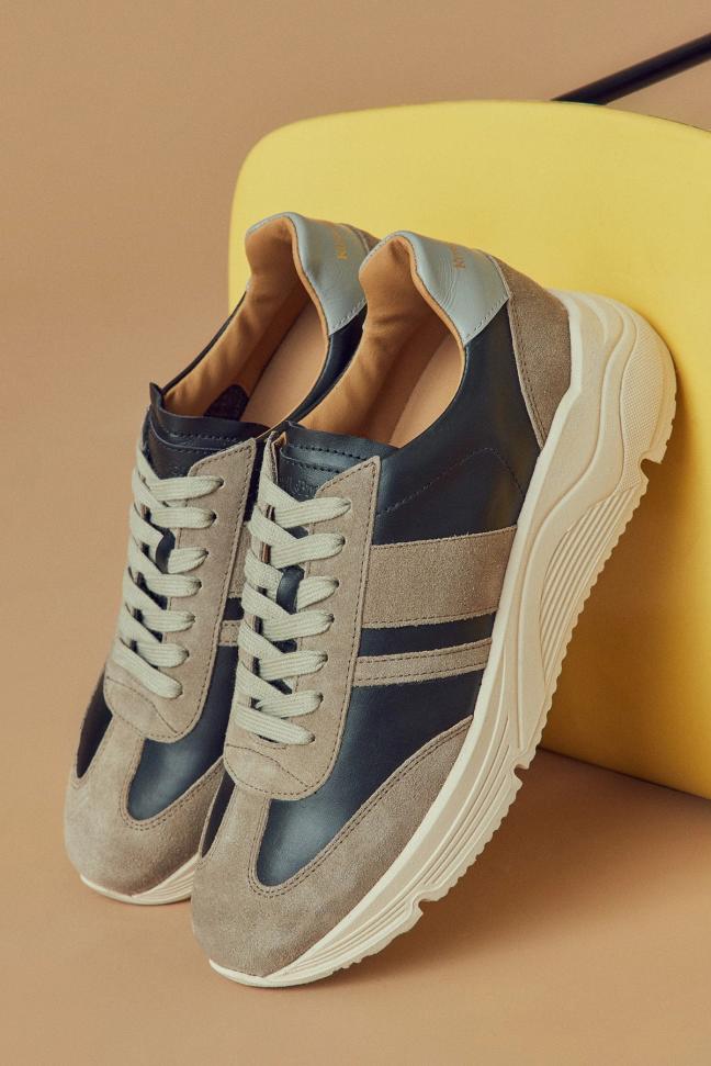 The design is crafted to leather-cut life in Italy, where striking khaki suede is layered on top of soft black full-grain and fitted with a grey heel cuff. These neutral, easily-matched colours pair with the supportive silhouette of a classic exercise shoe to give you a trainer that will walk (or run) alongside every item in your wardrobe with stylish, elegant ease.