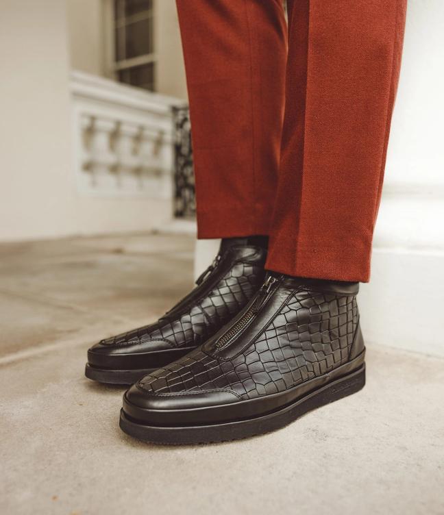 And talking of head-turning, take a look at these. Named for an unassuming town in Switzerland, the ‘San Nazzaro’ stompers are perhaps the boldest boots in the entire Russell & Bromley range. Finished with a smart zip, and handcrafted in Italy from specially stamped crocodile print leather, these high-top boots may be monochrome — but they make more impacts and impressions than even the most colourful shoes.