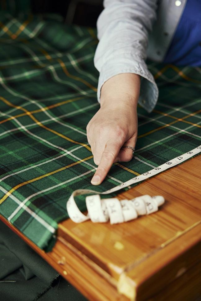 First up come the measurements. Unlike a tailored suit — which requires at least ten measurements — a bespoke kilt demands only three; your waist, your seat and the length from navel to kneecap. And each kilt, regardless of how slim or slender you may be, is constructed using between eight and nine yards of tartan: delicately pressed and pleated, then sewed and steamed into shape.