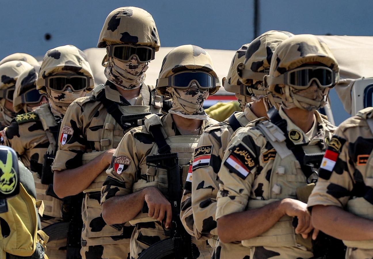 Egyptian army special forces soldiers deploy before the concrete barrier marking the border between Egypt and the Gaza Strip.