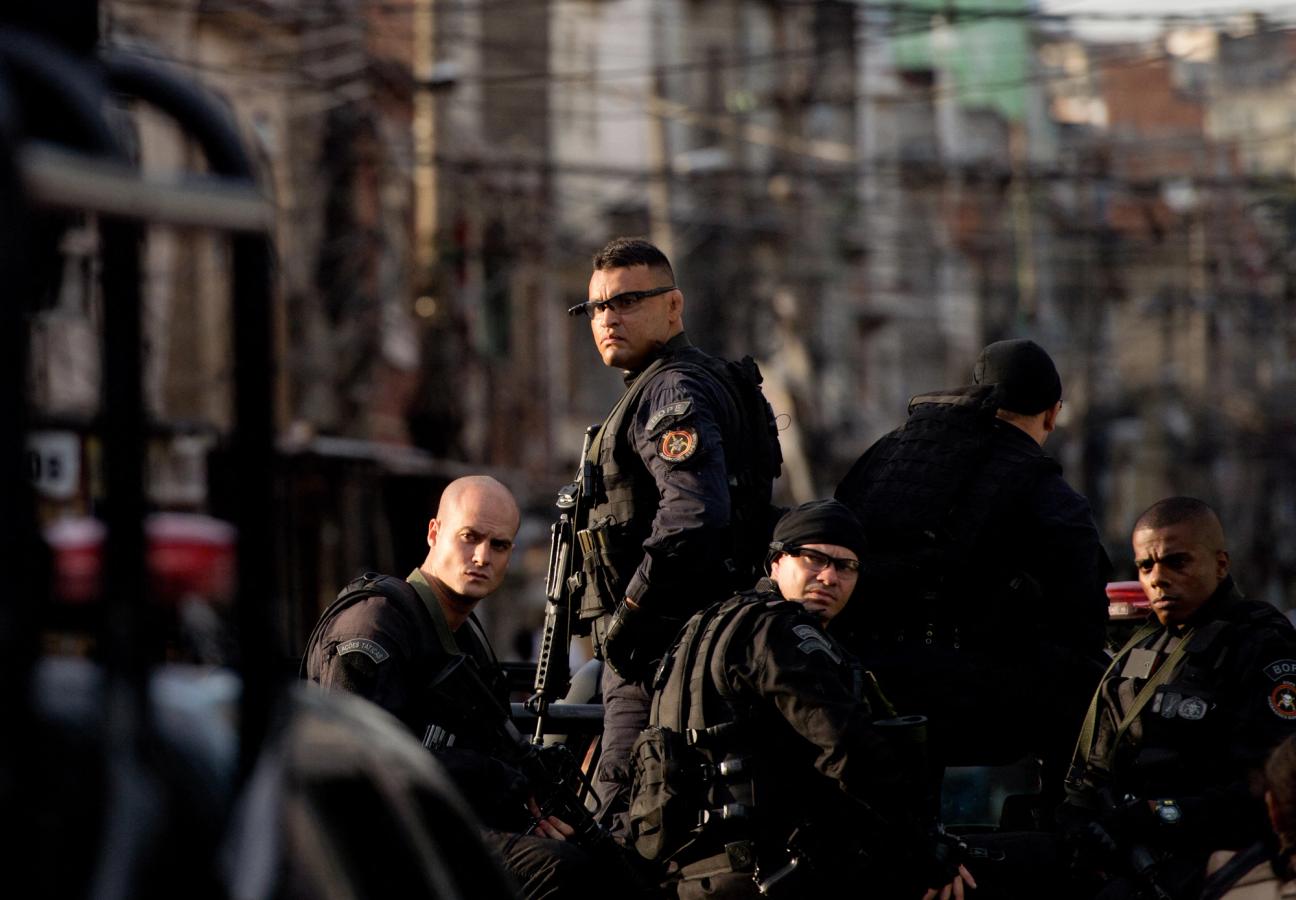 BOPE elite unit personnel patrol the Favela da Mare complex in Rio de Janeiro.