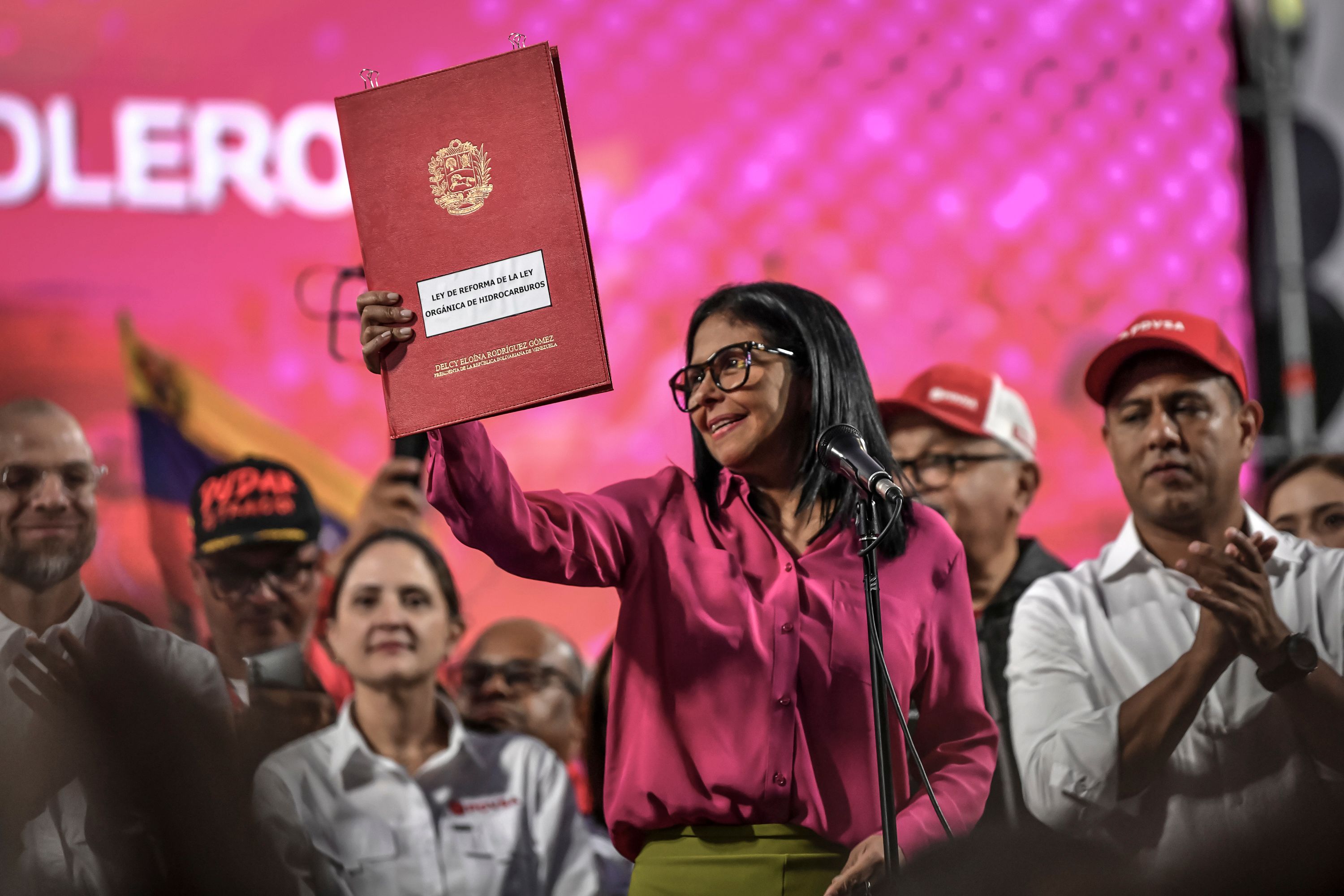 Delcy Rodriguez holds the new oil reform during an event at Miraflores Palace on 29th January 2026 in Caracas, Venezuela.