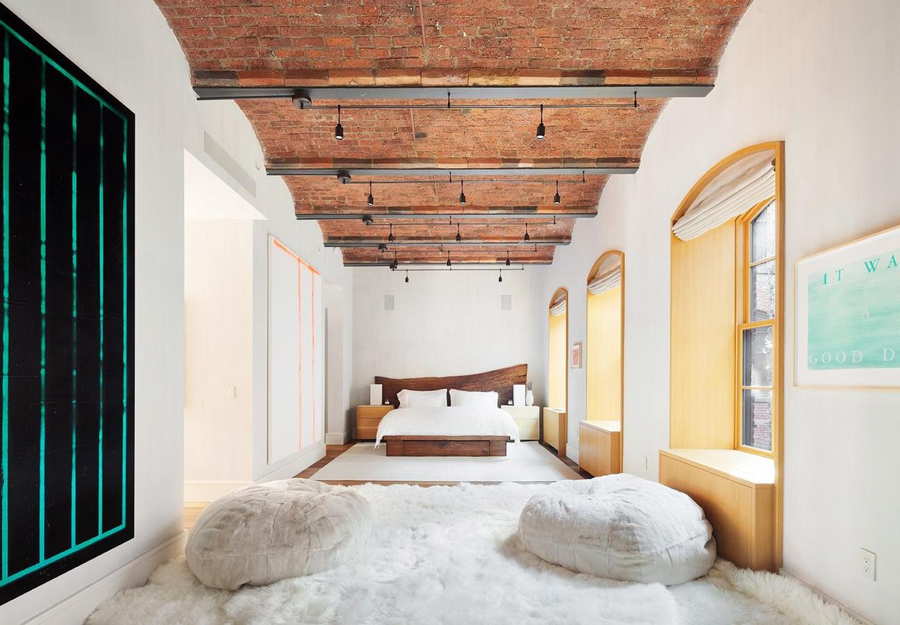 Originally built as a four-bedroom loft, the apartment has been converted into a three-bedroom home — with the master bedroom now stretching 31-feet in length. It features the same exposed brick ceilings as the living room, four large windows offering much natural light, and a lush courtyard garden designed by Ken Smith — the landscape architect who created the roof gardens at The Museum of Modern Art.
