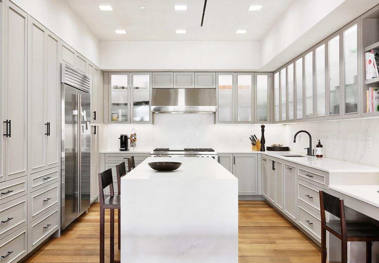 But perhaps the most impressive bit of the bathroom? The bathtub; square in shape, finished with brushed black hardware and hewn from Calacatta marble. It’s the same marble that you’ll find in the kitchen — specced to chef’s standards, the beautiful countertops encircle the room, framing a slab stone island and protecting every top-of-the-line appliance a movie star might need.