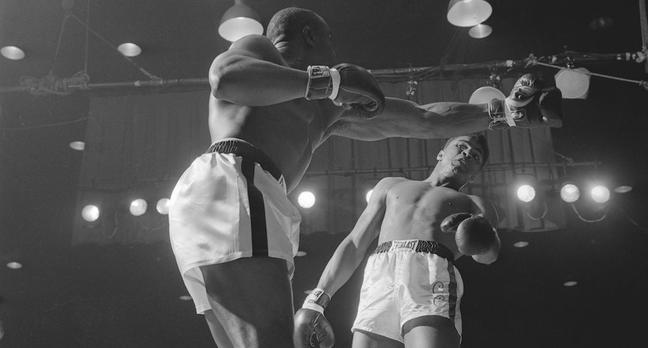 Clay drove over a volley of punches that hurt Liston at the start of the third. A cut opened under the Liston’s left eye but he tore after Clay and pounded him to the body. The cut looked wide and deep. Clay moved nimbly around the heavy-footed champion, but Liston got in a left and right to the body then a hard left to the jaw. Liston drove over a solid right and left to the jaw, but the punches did not seem to bother Clay. Liston’s seconds had an ice bag on the champion’s cut and swollen left side of the face. Clay blinked as if he could not see at the start of the fifth. Liston smashed him to the body with both hands, but Clay got away, then held.