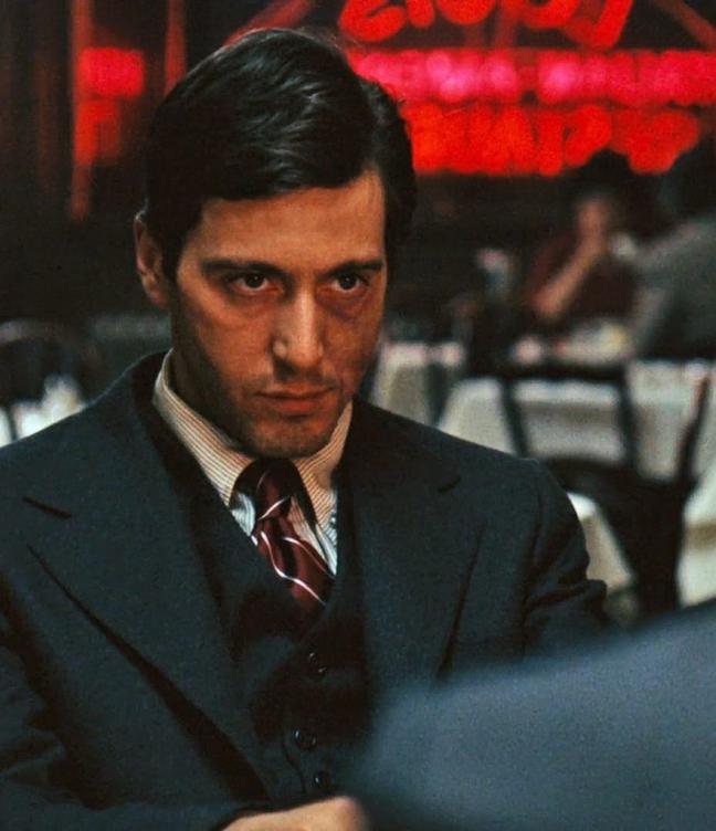 It’s a similar textured style to one Michael’s father wears earlier in the film — when Brando pairs a woollen jacket another patterned tie. So, if you’re looking to spruce up your off-duty suiting, what better than with something a little less slick? Hackett do a magnificent tweed option, if you’re looking to follow in Brando’s footsteps. Or, for Pacino’s classic cord look, why not go for a ridged cotton blazer from either Boglioli or SIRPLUS?