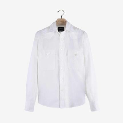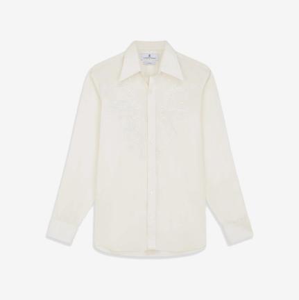 But by far the most prevalent style is the long-point collar. There’s something almost symbolic about the design; sharp points sitting like blades around the character’s necks — reminding us of the knife-edge upon their lives rest. It’s also, happily, a pretty natty look. Just look at Turnbull & Asser’s idiosyncratic attempt at the style; the patterned ‘Eamon’ shirt. It’s a similar approach to Drakes’ western-influenced option. Or, for a blend of Brando and Pacino, go for this button-down long-point shirt, from Eton.