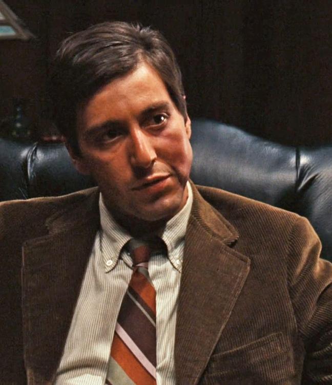Perhaps our favourite outfit in the entire epic belongs to Al Pacino. When Michael suggests that he kills Sollozzo and McCluskey — to the initial amusement of Sonny and Robert Duvall’s Tom Hagen — the youngest Corleone is wearing a button-down shirt, striped tie and corduroy blazer. It’s a sufficiently Ivy League look for, as Sonny brands Michael, “a nice college boy”. But boy, do we like that blazer.