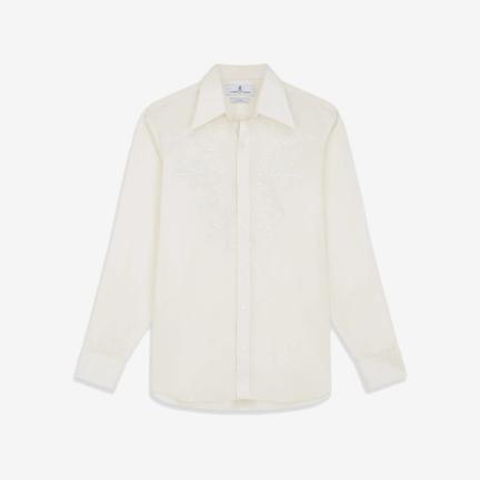 But by far the most prevalent style is the long-point collar. There’s something almost symbolic about the design; sharp points sitting like blades around the character’s necks — reminding us of the knife-edge upon their lives rest. It’s also, happily, a pretty natty look. Just look at Turnbull & Asser’s idiosyncratic attempt at the style; the patterned ‘Eamon’ shirt. It’s a similar approach to Drakes’ western-influenced option. Or, for a blend of Brando and Pacino, go for this button-down long-point shirt, from Eton.