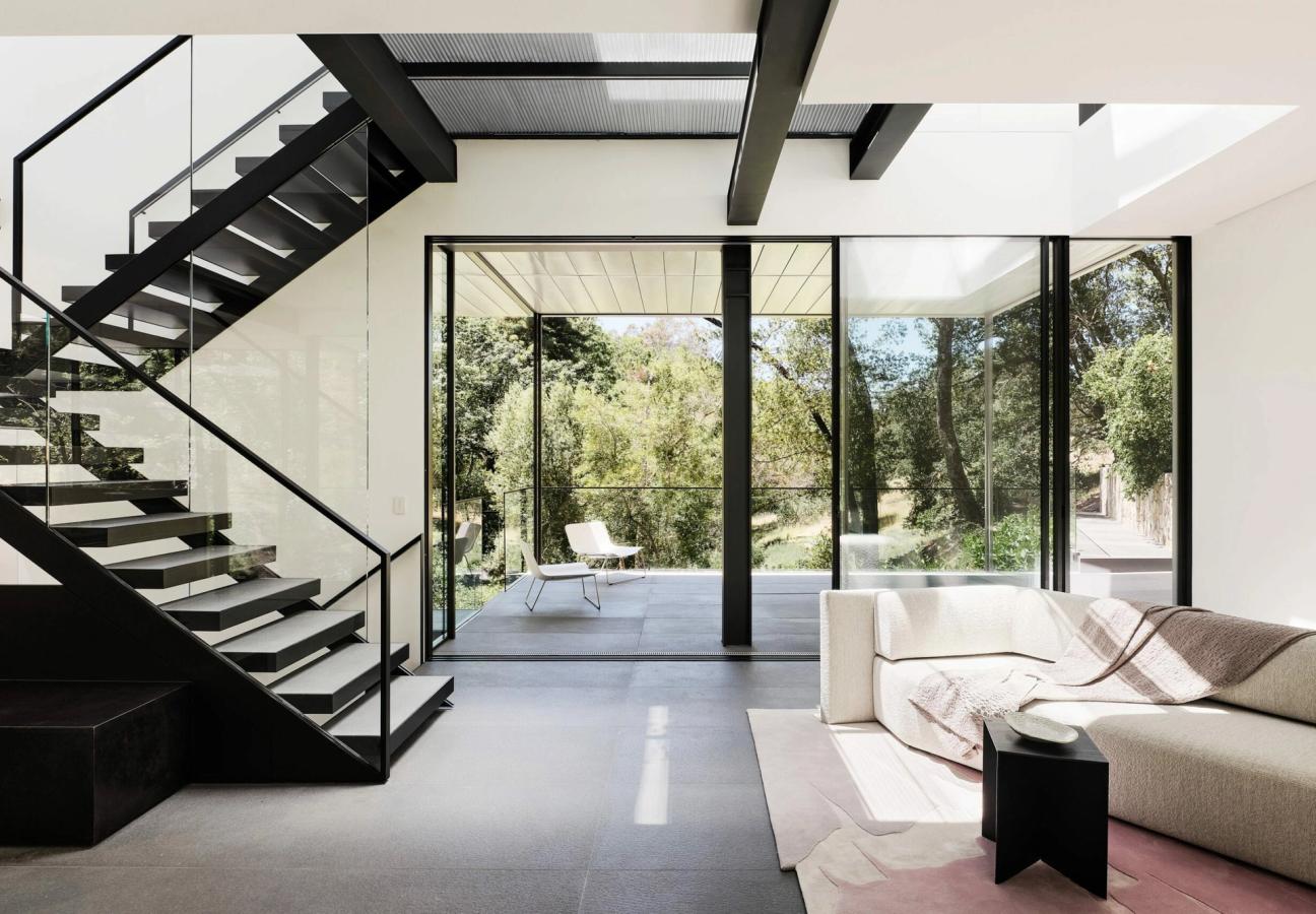 The team also wanted to showcase the water below, so opened up any site-lines and used transparent materials, floor-to-ceiling windows, see-through floors and open-concept outdoor spaces including floating staircases to ensure that the creek was visible from the front, back and inside of the house; an all-natural statement centrepiece.
