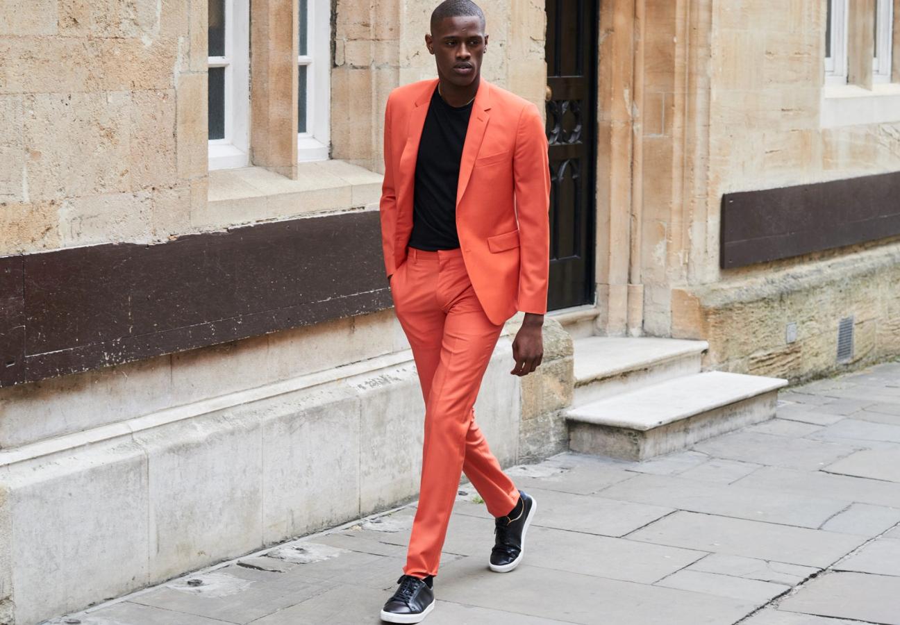 Orange suit by Paul Smith, black T-shirt by Acne Studios