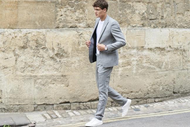 Grey suit by Hardy Amies at Savoy Tailors Guild, white T-shirt by Acne Studios