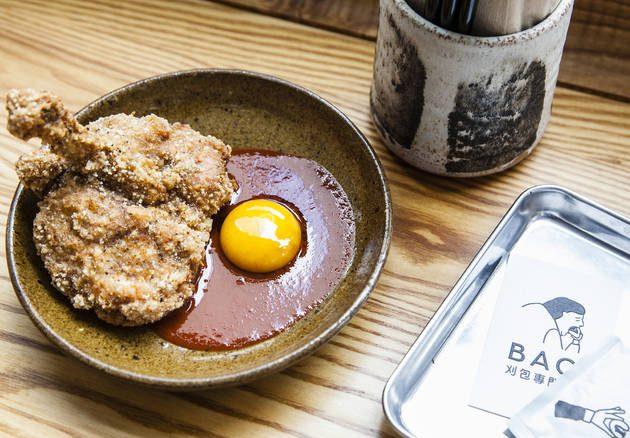 Bao — Taiwanese fried chicken chop with soy egg, Bao’s logo is a line drawing of a sweet, hunched over, utterly contented little man, stuffing a buoyant, fluffy bun into his mouth, eyes closed in glorious surrender. It is precisely how you feel at almost every bite. The chicken chop is particularly overwhelming. 3 Lexington St, Soho, W1F 9AS