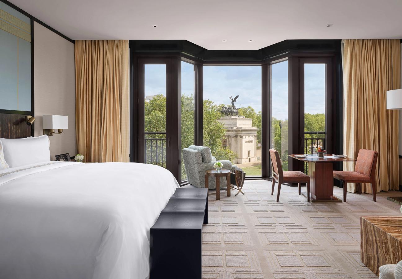 And recently came London, in a behemoth new development off Hyde Park Corner – the city’s first stay to rack up a billion-pound development fee – with an eyeball-to-eyeball position opposite The Lanesborough hotel, and an almost entirely enclosed blueprint to make it feel as though nothing else exists outside the building’s graceful pleasures. The atrium at the centre of it all is high enough to host a Harlem Globetrotter’s exhibition and has the type of detailing – moulded ceilings, de Gournay landscape murals, tall pillars and big chandeliers – that might remind you of that time you toured the mansions of Bel-Air. The French toast at breakfast has the glassy bite of caramelised sugar that the best crème brûlées possess, and the poached eggs naturally come with the option to have a bit of osetra caviar spooned on top.