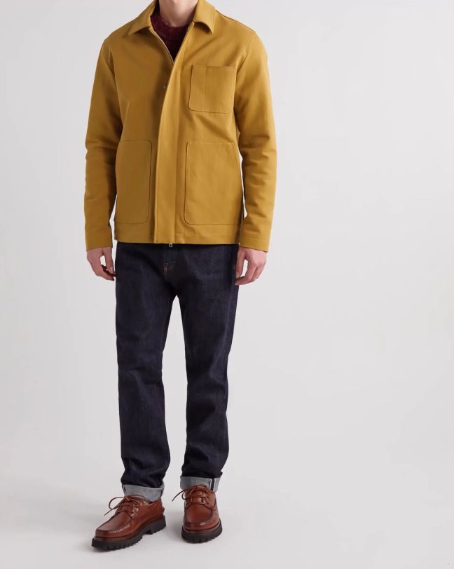 So how to deploy it? We’d throw it on in bold blocks. That could mean it forms the base of your outfit, such as Drake’s crew neck cotton sweatshirt, or it might mean a pop of ankle-level, eye-catching colour courtesy of New & Lingwood‘s punchy socks, but it pays to put this saturated shade to striking use. Our favourite option? This classic, cargo-inspired workers jacket from Mr P. — light enough for spring; bright enough for summer.