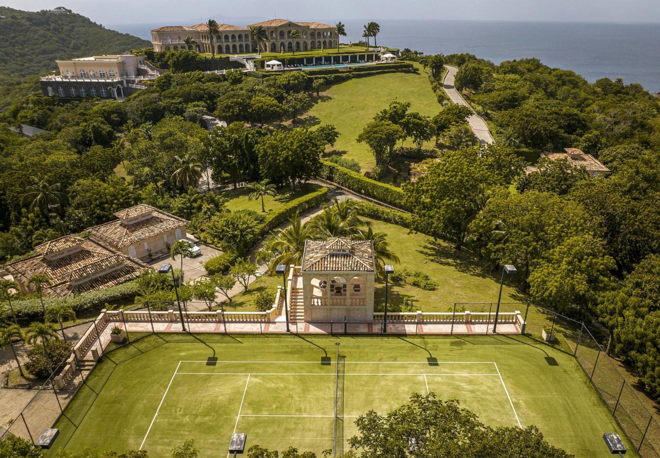 Here, a shimmering infinity pool appears to cascade directly onto the rolling green hills and down to the turquoise seas beyond, while inside, there’s provision for a cinema and a games room for when the dusk rolls in over the bay. Further away, across a rolling lawn, perhaps the finest tennis court on the island basks in sun-drenched splendour.