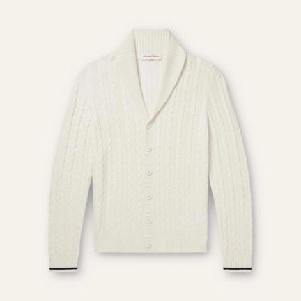 For items of this ilk, we recommend you forego the fairisle knits (again, such patterns are a matter of taste rather than that of universality and versatility) and reach for the blank-canvas options. Most notably, the ‘Dolcevita’ cableknit sweater, by Aurélin, comes in a wear-anywhere navy hue, and its blend of cashmere and extrafine merino wool guarantees a soft feel; then, when wrapping up, finish things off with the brand’s equally luxurious maroon scarf, which provides a strong, but complementary, contrast. For a seasonal white-Christmas touch, Orlebar Brown has crafted a cream-hued chunky shawl-collar cardigan that’s finished with a navy trim.