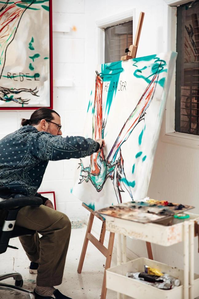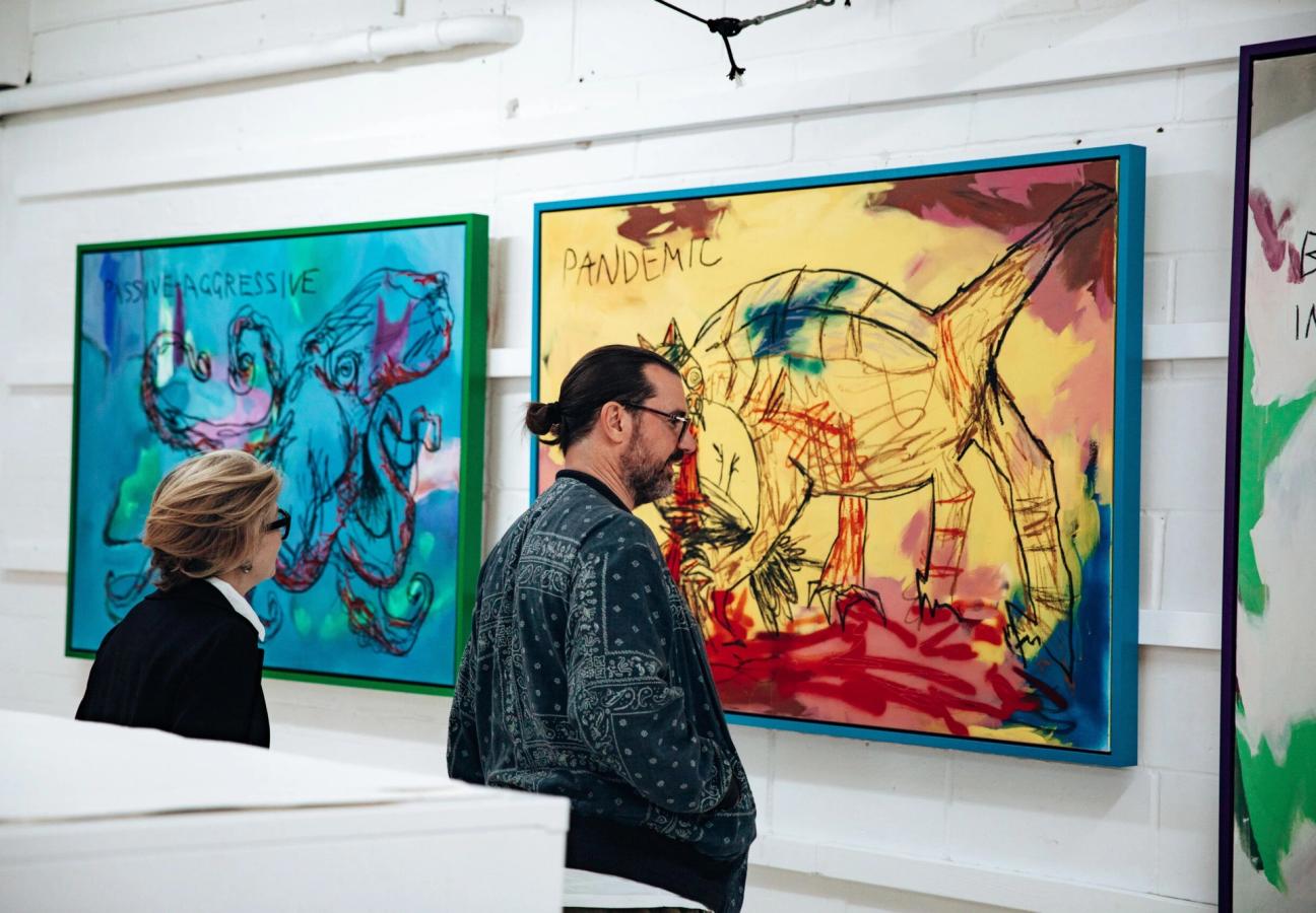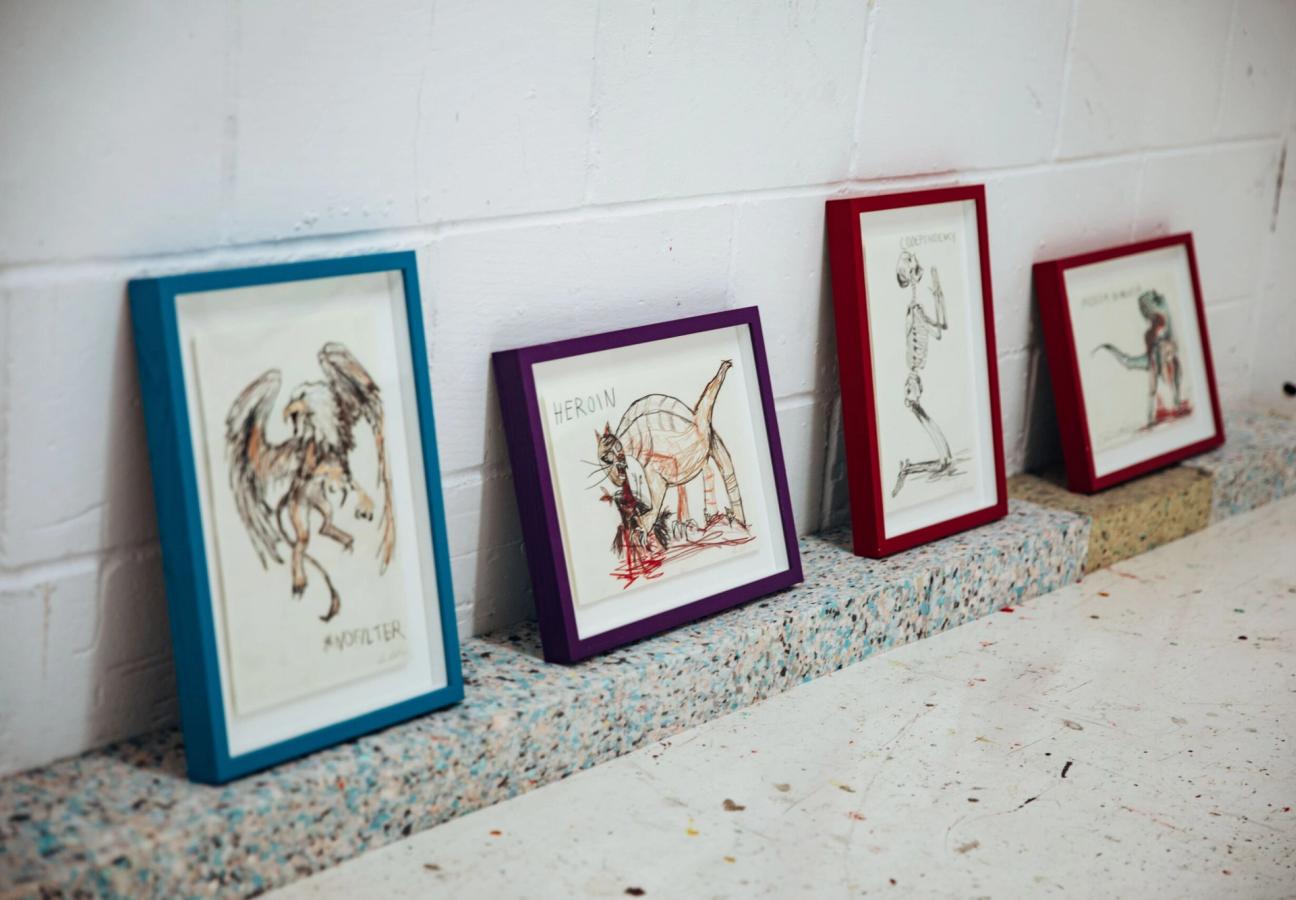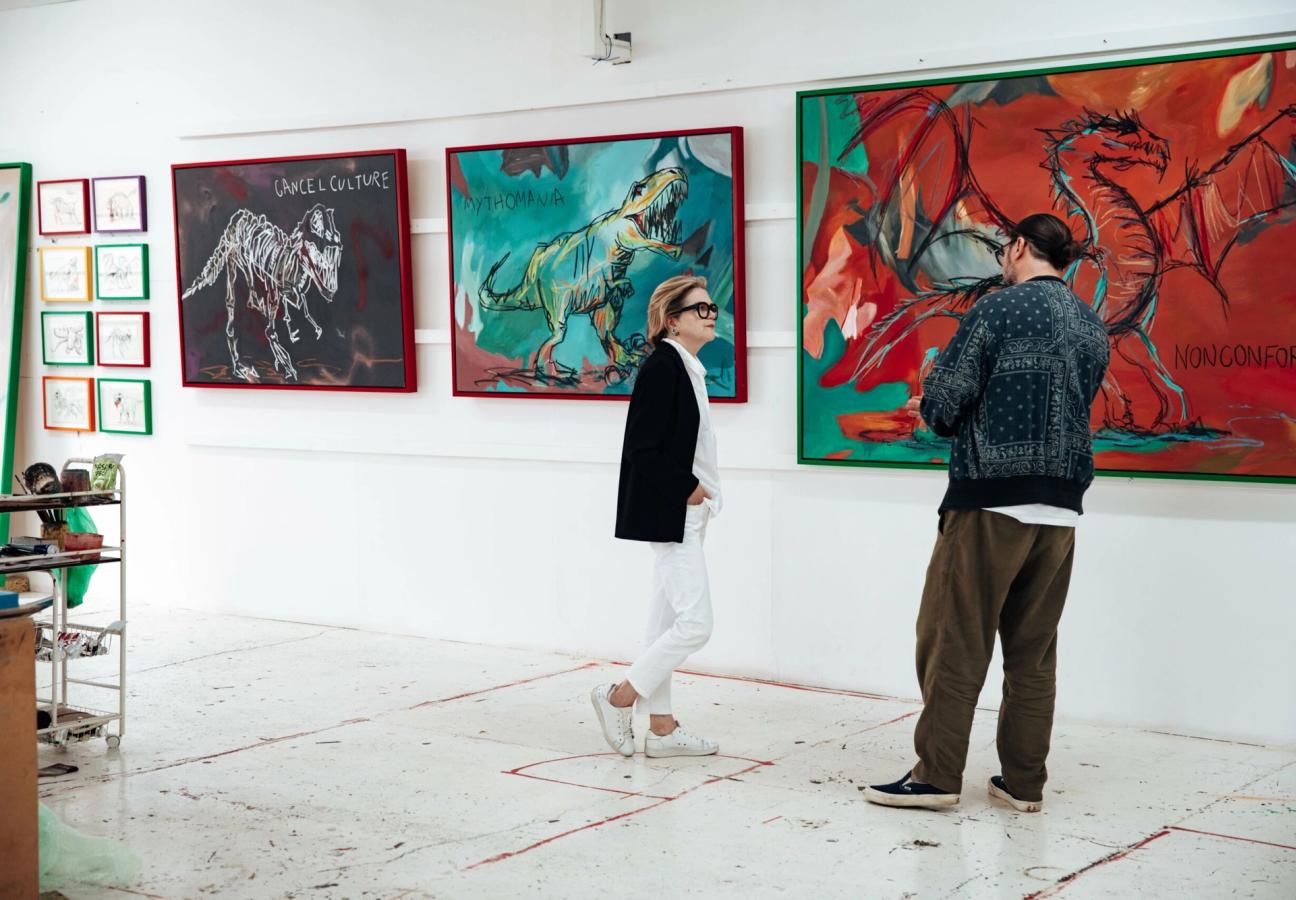 In a way, then, the duo’s latest exhibition is the natural, pleasing conclusion of that story arc. The pairing of potent imagery with pithy social commentary is still alive and well in ‘Mythomania’, which opens at Maddox Gallery on Westbourne Grove on the 23rd June. (There will also be a brilliant raffle, by the way, to win an original artwork in support of the Teenage Cancer Trust.) But now the artists feel no need to therapise under a pseudonym — they’re being entirely themselves, at work and at play. Using childlike ‘regression’ sketches set in bold, vibrant colours and crayola-grade scrawls, the pair render dinosaurs, dragons and vast beasts alongside highly-modern anxieties and buzzwords. The power is in the innocent incongruity — a sort of uncanny valley effect, not dissimilar to watching your toddler nephew nimbly navigating an iPad. And from the youthful exuberance of the pictures a central concern leaps out. Aren’t we all just kids, playing at being adults — and isn’t that half the problem? And should we just return to a simpler time — a prelapsarian, pre-digital age that now seems as distant as the land of the dinosaurs? In an exclusive interview with Gentleman’s Journal, the brothers discuss living through the age of anxiety, Cartel members-turned-therapists, and moving into the woods for good.