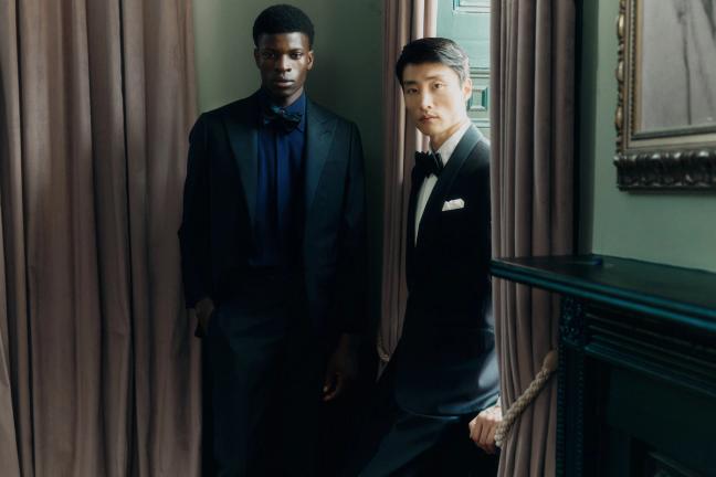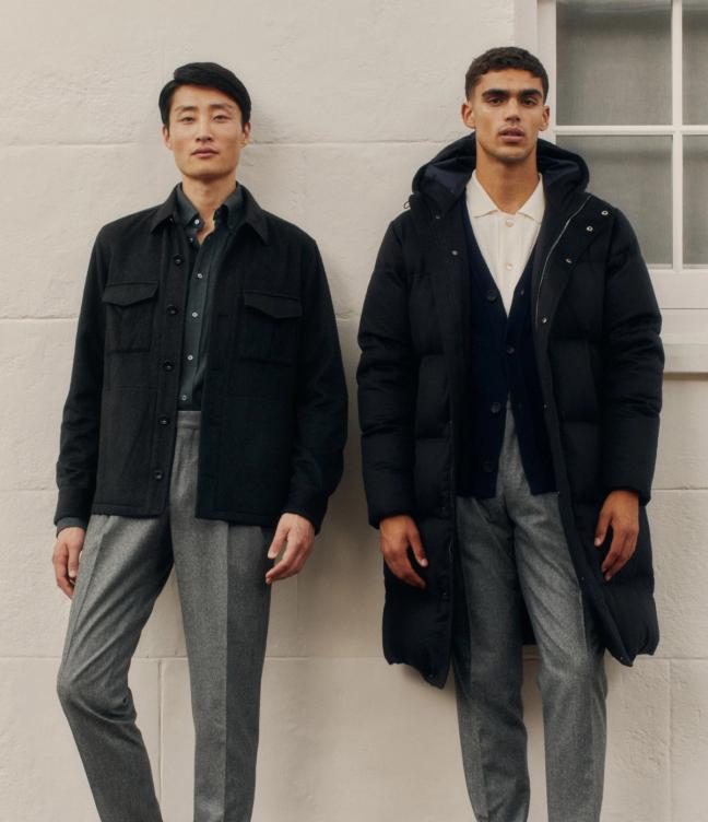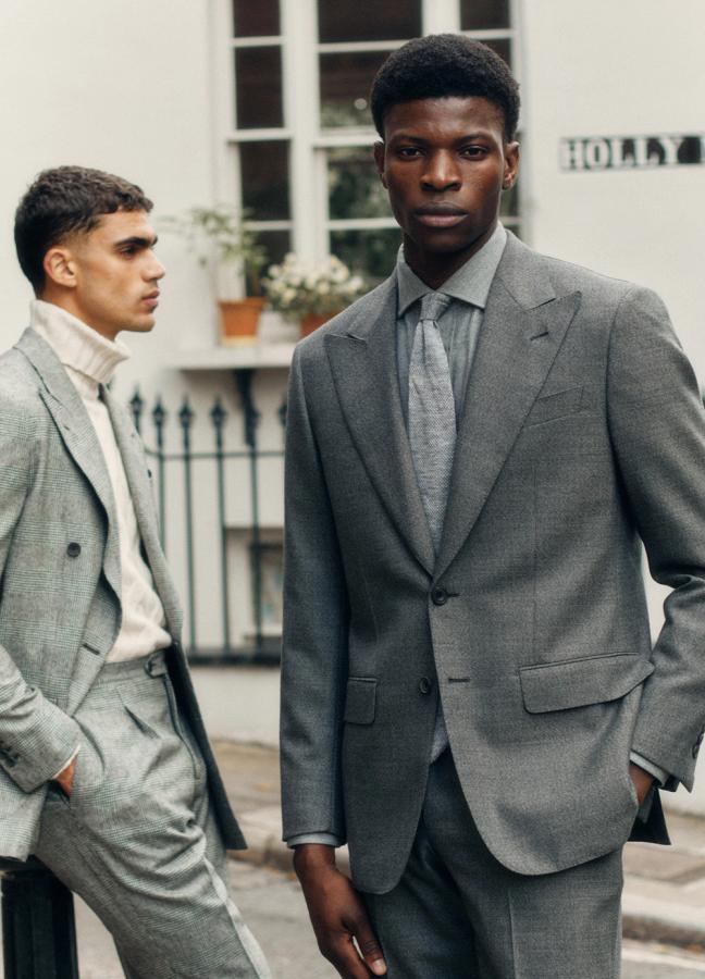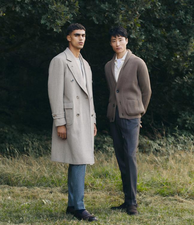 Starting at the formal end of the spectrum, notable items include the grey and navy peak-lapel single-breasted suits, foundational pieces that are versatile when worn effectively, as they can be dressed up with a shirt and tie for the boardroom, or made casual with a polo or fine-gauge knit – the latter being a signature move of both Thom and Luke.