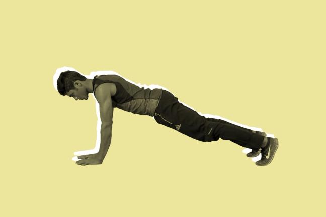 Like a lower impact burpee, this exercise starts in a standing position. To complete one rep, you must lower yourself into a high plank and then, once in the high plank, simply return to standing — and don’t jump. Repeat as many times as possible.