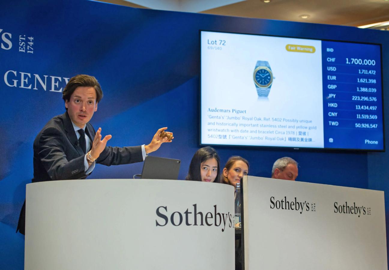 This particular Royal Oak is unique features a yellow-gold bezel that Genta produced and added himself in his workshop in Switzerland. So no wonder it entailed a six-minute bidding battle between seven contestants (conducted by Benoit Coulson, pictured in action) and no wonder it fetched more than seven times Sotheby’s’ frankly ridiculous low estimate of CHF 300,000.