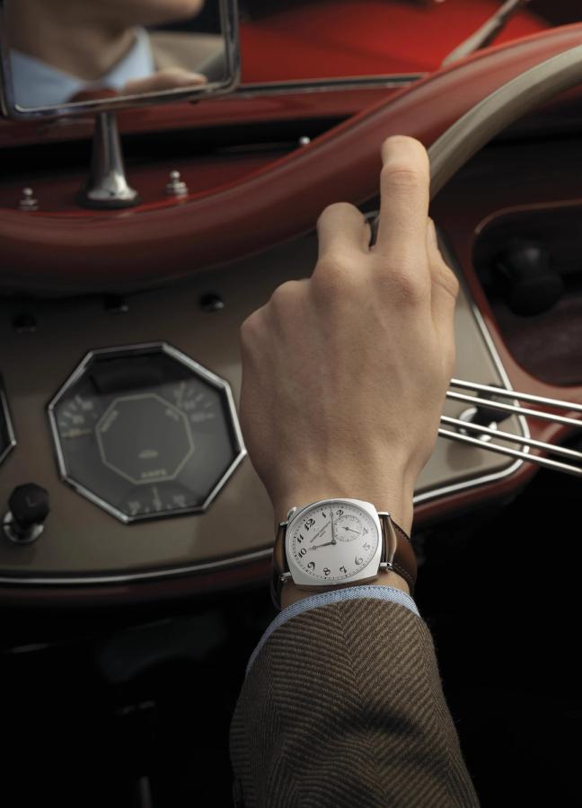 The design was a masterstroke; a fusion of art deco styling and practicality. The yellow gold case stayed straight; suspended between the straps. But the white dial was skewed diagonally, shifting the 12 o’clock marker to the top right corner of the case. The crown also revolved, resulting in a completely contemporary look — a new watch for a new decade. Or, as the Swiss Maison described it at the time, a model “for an American client with a passion for cars”.