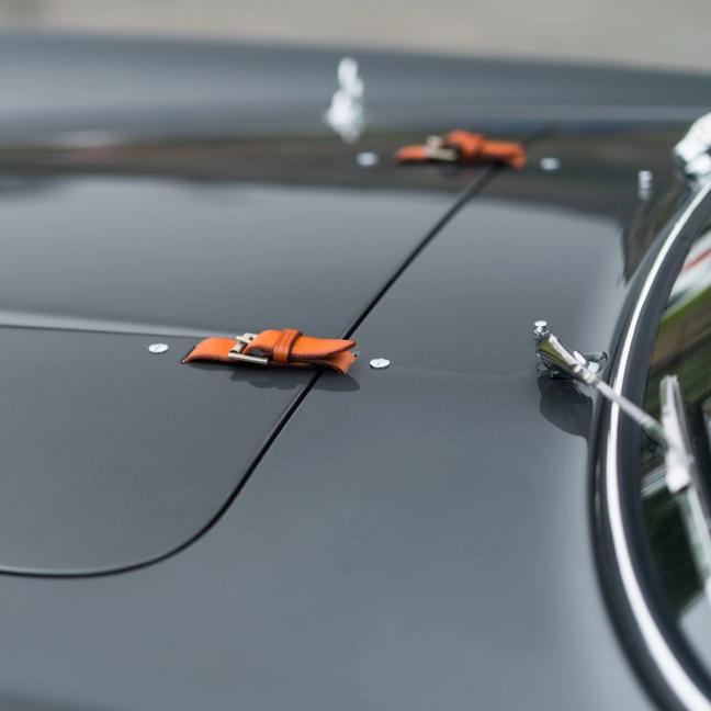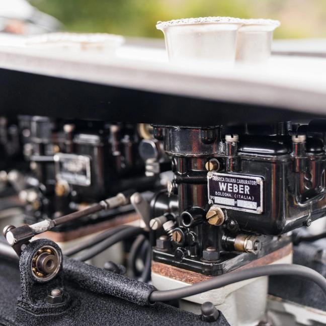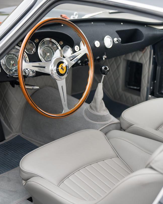 The Berlinetta was prepared for racing use with unusual competition features such as a rally-style passenger seat with adjustable rake and a headrest, sliding lightweight Perspex windows, bare interior door panels with simple pull-cable releases, and cabin-cooling fender vents.