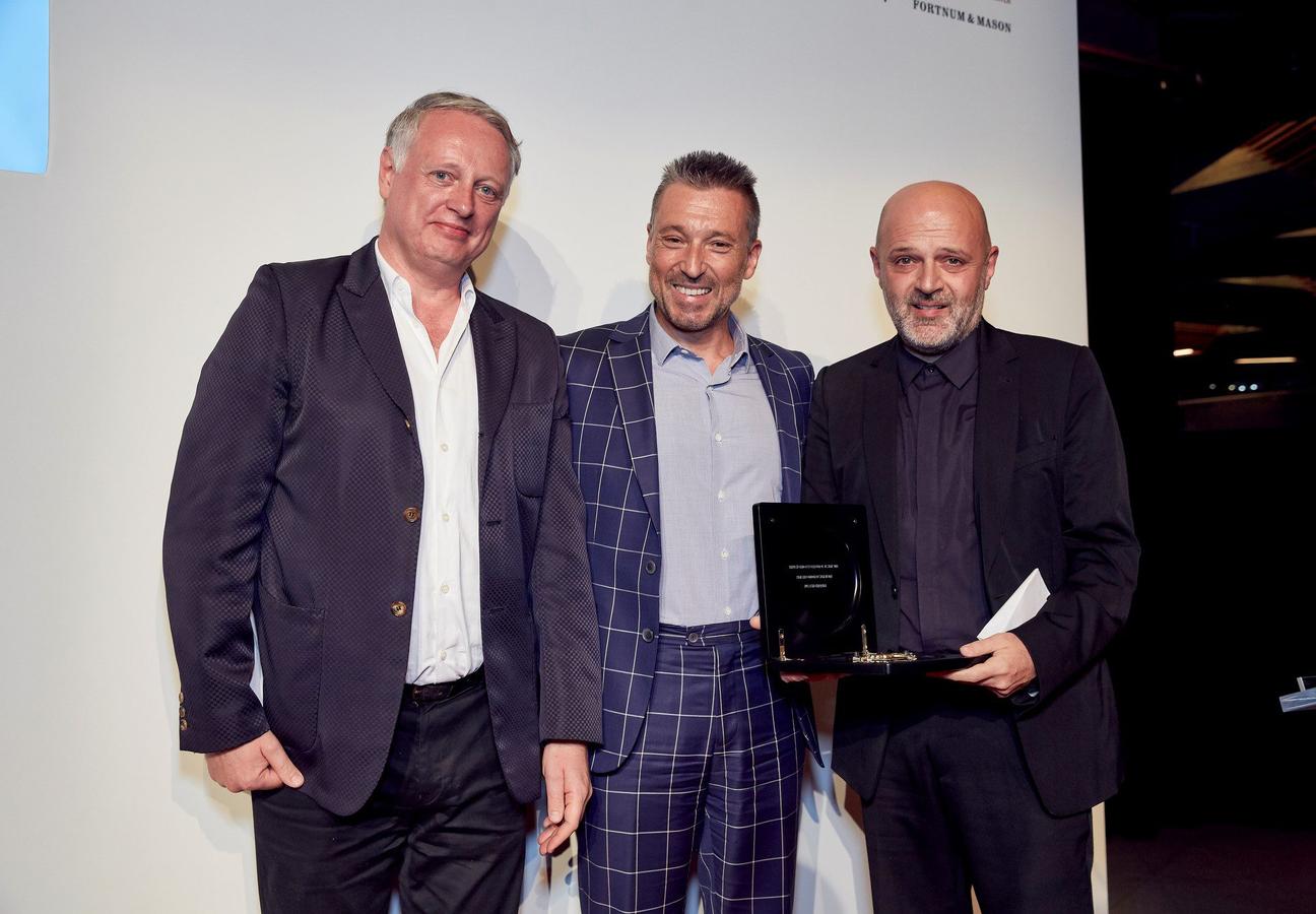 Left to right: Ben Evans, Director of London Design Festival and Jean Marc Pontroué, CEO of Panerai presenting Hussein Chalayan with the medal