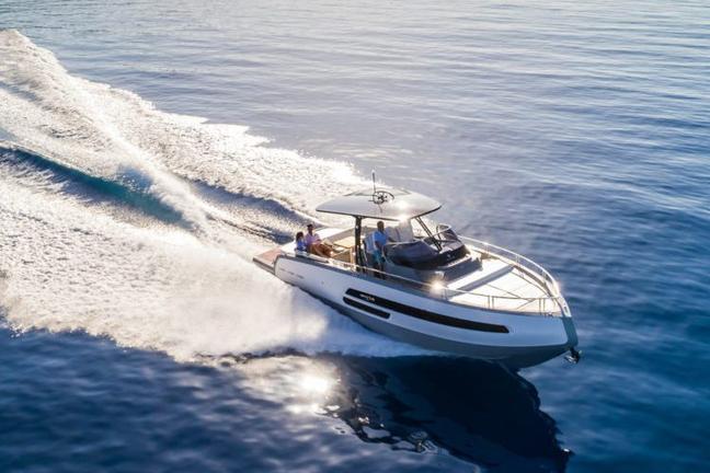 Nominated for the European Powerboat of 2017 award, the 11.4-metre 370 GT from Invictus Yacht is a unique vessel. With a submersible stern deck, a central deck that can transform into a sunbathing zone and an opening side platform which increases space on board, the 370 GT includes mod cons that are rarely found on boats of a similar size. Other design features include a reverse bow with lateral windows integrated into the hull and two large cabins. In terms of mechanics, the owner has a choice of inboard-outboard diesel engines: either a twin Volvo 300 hp or 370 hp Mercruisers.
