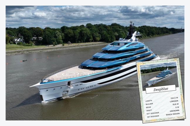 The 130m "Project Deep Blue" is reportedly owned by Chinese entrepreneur Richard Liu. Her interior design and exterior styling comes from the drawing boards of Winch Design, while Lurssen is responsible for her naval architecture. She features a curved infinity pool, a large beach club, a heli-capable bow, a sloping mast and unconventional lower-deck glasswork.